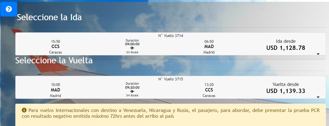 De acuerdo a la información difundida en su cuenta oficial de Twitter, la aerolínea estatal ofrece una frecuencia semanal los días sábado, saliendo a las 03:50 de la tarde (Caracas) y retornando a las 10:00 de la mañana, desde el Aeropuerto Internacional Adolfo Suárez Madrid – Barajas.