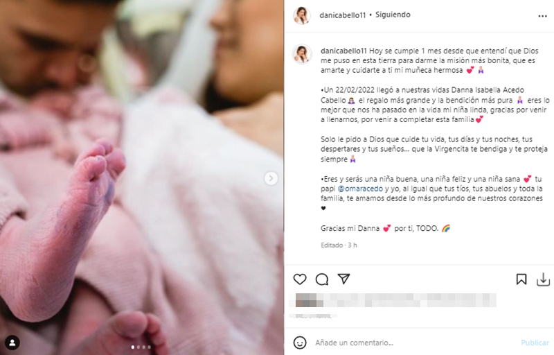 «Un 22/02/2022 llegó a nuestras vidas Danna Isabella Acedo Cabello. El regalo más grande y la bendición más pura. Eres lo mejor que nos ha pasado en la vida mi niña linda, gracias por venir a llenarnos, por venir a completar esta familia», agregó.